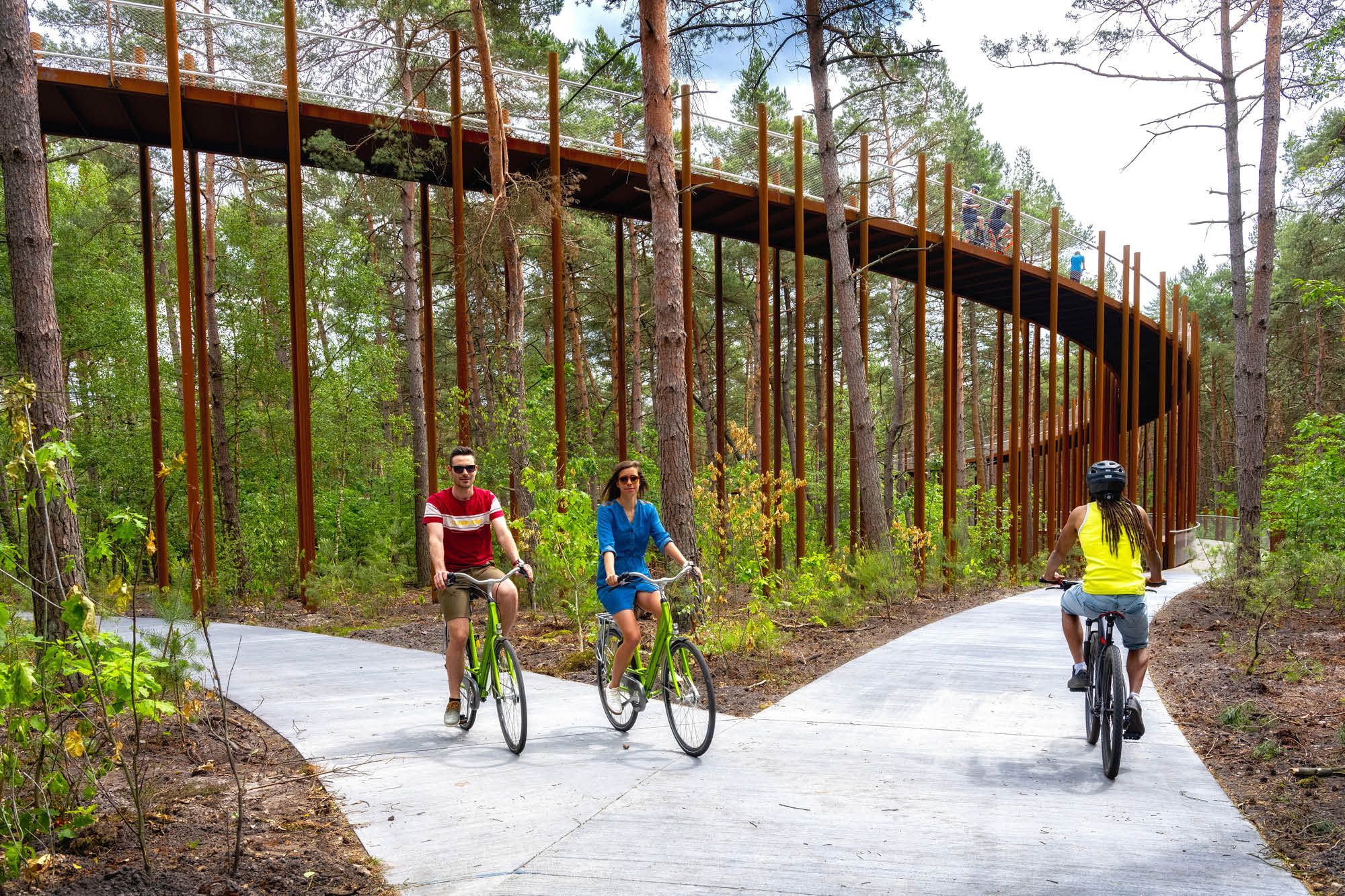 Faire du vélo à travers les cimes des arbres du Pijnven à Bosland (Hechtel-Eksel) est une expérience cycliste à l’initiative de la province du Limbourg. Cette expérience cycliste, qui se raccorde au réseau de pistes cyclables, consiste en un double cercle étroit de 100 m de diamètre. Le chemin fait 700 m de long et monte progressivement de 3 à 4 % jusqu’à 10 m de hauteur, pour ensuite redescendre à plat après 9 m. L’expérience réside dans l’interaction avec la nature, la sensation de grandir avec les arbres et de «flotter» en s’élevant. Les 450 colonnes uniques en acier auto-patinable («corten») sont placées alternativement à 1, 2 et 3 m l’une de l’autre et symbolisent les troncs droits des conifères, comme ils étaient autrefois utilisés dans la mine. De cette façon, la construction s’intègre parfaitement dans l’environnement. Les pieux de soutien ont été fixés dans une fondation solide de pieux en acier vissés, qui minimisent l’impact de la construction sur l’environnement naturel.