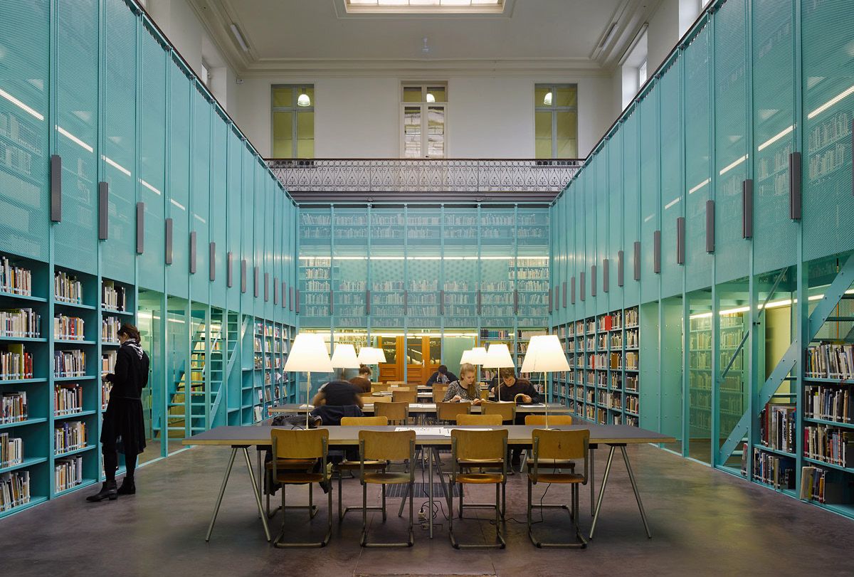 La nouvelle bibliothèque pour le groupe de spécialisation Architecture et Urbanisme de l’Université de Gand a été conçue comme un grand meuble-pavillon à trois étages qui occupe l’espace sous le balcon dans l’ancienne salle de travaux pratiques. Le périmètre du bâtiment est formé par des bibliothèques. En faisant coulisser un grillage devant celles-ci, la collection est rendue accessible ou non de manière à protéger les livres lorsque d’autres activités ont lieu comme des réceptions et des conférences, …