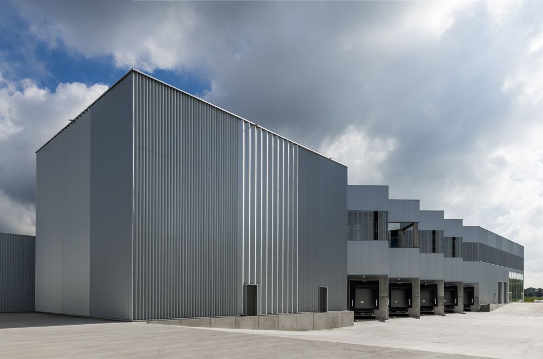 Dans ce projet, aucune façade en acier standard n’a été utilisée, mais il a été décidé de particulariser la façade. Avec le producteur ArcelorMittal, une façade sur mesure a été conçue. Celle-ci comporte une combinaison de 3 profils différents de façade en acier cintré avec un revêtement en aluzinc. En prévoyant les profils de pointe dans différents angles, on obtient un jeu de lumières et, bien que le bâtiment ait la même couleur, un aspect varié de la façade.