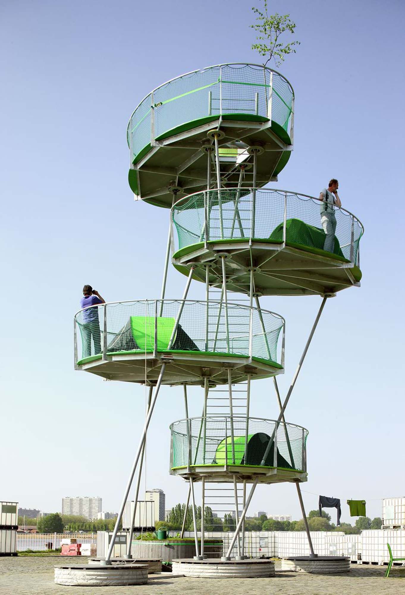 Urban Camping - le camping en ville - semble être une contradiction, mais répond en fait à une demande réelle. L’intérêt croissant pour les city-trips et le succès des voyages low-cost poussent à repenser les infrastructures urbaines d’hébergement. IEA a présenté une première proposition pour un nouveau type de camping urbain à petite échelle. L’Urban Camping est un quadruple empilement d’un modèle de base à structure tridimensionnelle. Ce modèle de base est constitué d’une tôle résistante à la flexion supportée par des poteaux qui y sont assemblés par articulation. On peut montrer qu’au moins 6 poteaux sont nécessaires pour obtenir une structure solide et stable. L’inclinaison des poteaux leur permet de reprendre ensemble les charges verticales et horizontales.