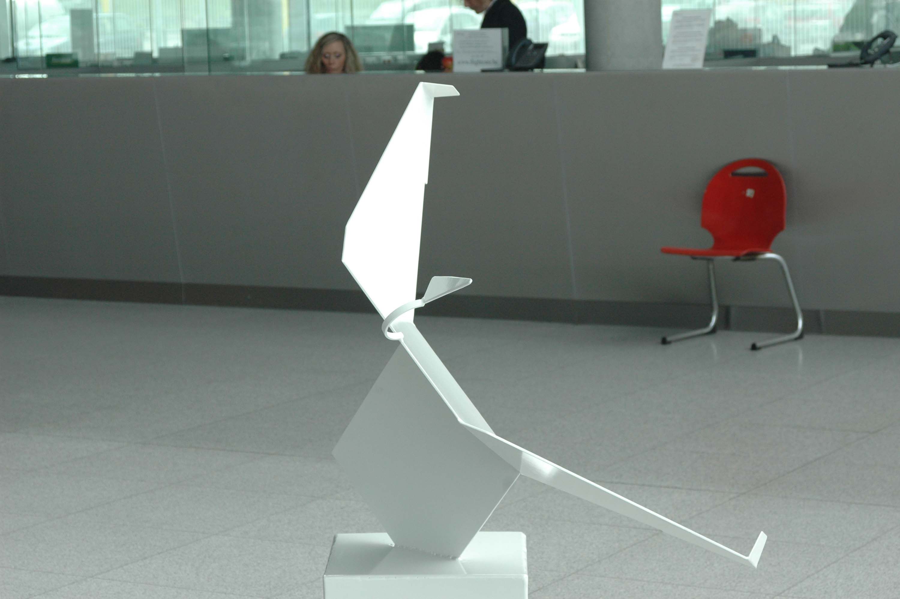 Cette sculpture a été offerte par Lloyd DOS SANTOS DIAS à l’aéroport de Bierset. Sculpteur liégeois, il crée de magnifiques réalisations en acier qui trouvent leur place dans des parcs d’exposition ou dans des musées, notamment au MAMAC à Liège. Pilote de planeurs, Lloyd DOS SANTOS DIAS est passionné d’aviation. TAKE OFF, mi-avion, mi-oiseau, est un hommage aux aviateurs et aux créateurs d’avions, qui ont pu trouver chez les oiseaux toute l’inspiration pour réaliser le plus vieux désir de l’homme… voler… La sculpture est entièrement en Acier S235jr, d’une épaisseur de 5 mm. L’œuvre est entièrement soudée à l’électrode enrobée de 2.5 de diamètre. Certaines parties sont découpés au laser, comme les ailes, et la face avant avec le lettrage Take Off. Peinture époxy blanc de finition.