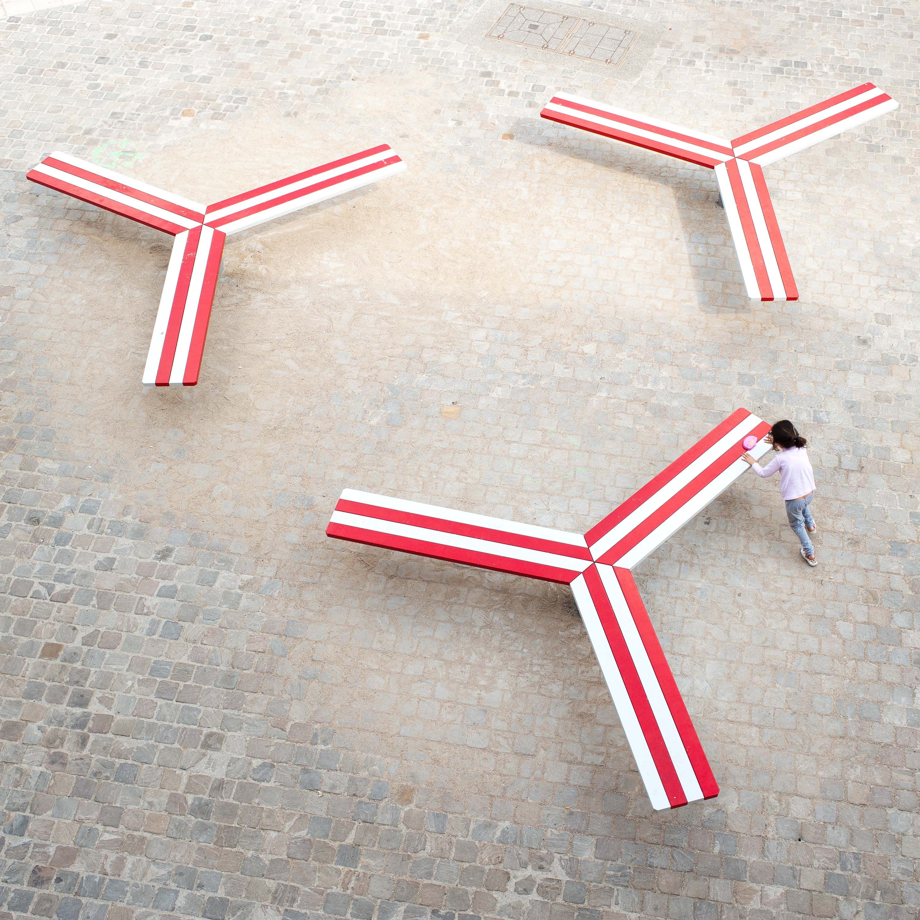 La Commune d’Anderlecht a organisé un concours pour l’installation de mobilier urbain. Lauréat, Yspilon se compose de 3 bancs en étoile à 3 branches. Evoquant les tourniquets des plaines de jeux, ces bancs sont mobiles sur leur axe. La structure des bancs est réalisée en acier thermolaqué, tandis que l’assise proprement dite est réalisée en bois. Cette structure se compose de deux pièces. La première est le socle, composé d’une platine ancrée au sol et d’un tube supportant un roulement de type iglide du fabricant américain Igus. Ce type de roulement polymère présente deux qualités essentielles pour ce projet : il ne nécessite aucun entretien, étant autolubrifiant et insensible à la corrosion, et il présente un coefficient de friction faible tout en ne permettant pas une rotation libre (autofreinage). La seconde partie supporte l’assise en lattes de chêne. Elle est composée de 3 bras tétraédrique en tôle pliée, fixés sur un tube central chapeautant le socle.