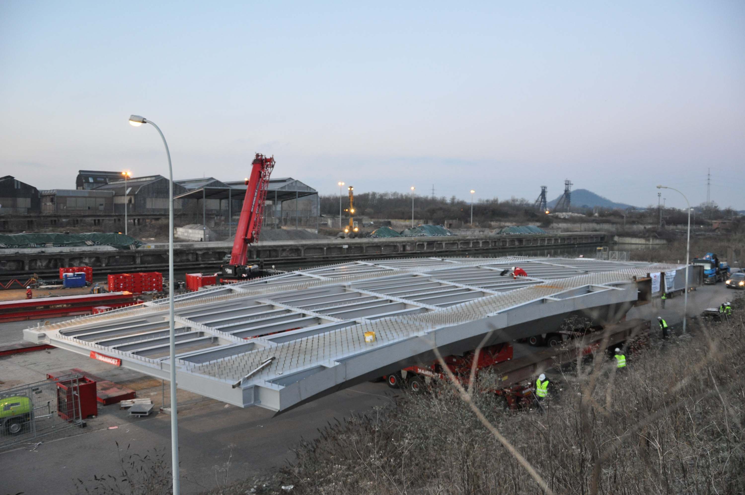 Les travaux d’extension du Métro Léger de Charleroi ont pris fin en 2012. Dans la boucle Sud, le tram sortira de la station et traversera la Sambre, via un nouveau pont courbe partiellement planté. La conception du pont est particulièrement complexe. Sa portée est de 53 m, son poids est de 1060 Tonnes dont 500 tonnes de structures métalliques. L’ouvrage est composé de 3 caissons droits, d’entretoises métalliques, et d’une dalle collaborante en béton armé. Les difficultés rencontrées lors de l’étude sont les conséquences de la géométrie du pont et des sollicitations présentes : courbure, dévers, différences de niveaux entre les deux quais, porte-à-faux, phénomènes dus à la fatigue, appuis sur des quais en porte-à-faux via une dalle souple.