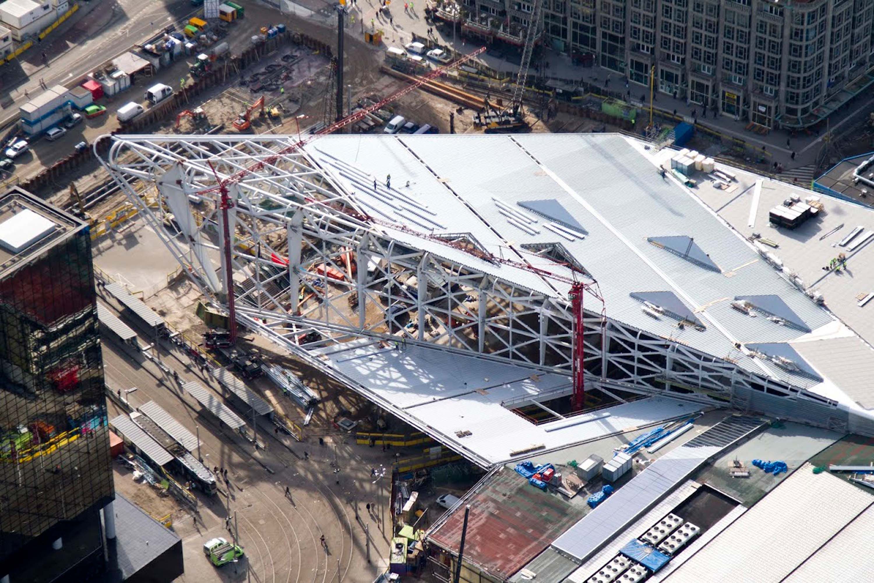 De staalstructuur wordt gedragen door 4 unieke hoofdspanten met een vrije overspanning tot 120 m. De spanten van de in 2 richtingen gezeegde dakvlakken bestaan uit zowel vakwerkstructuren als uit plaatmateriaal opgebouwde elementen met een plaatdikte tot 100 mm. Dak en geveldelen kregen een toplaag van RVS 316L met een dikte van 0,5 mm. Uniek detail: de 3.500 ton wegende staalconstructie boven het nieuwe metrostation moest zo worden gebouwd dat de oppervlaktedruk op het metrodek niet groter was dan 1 ton/m2.