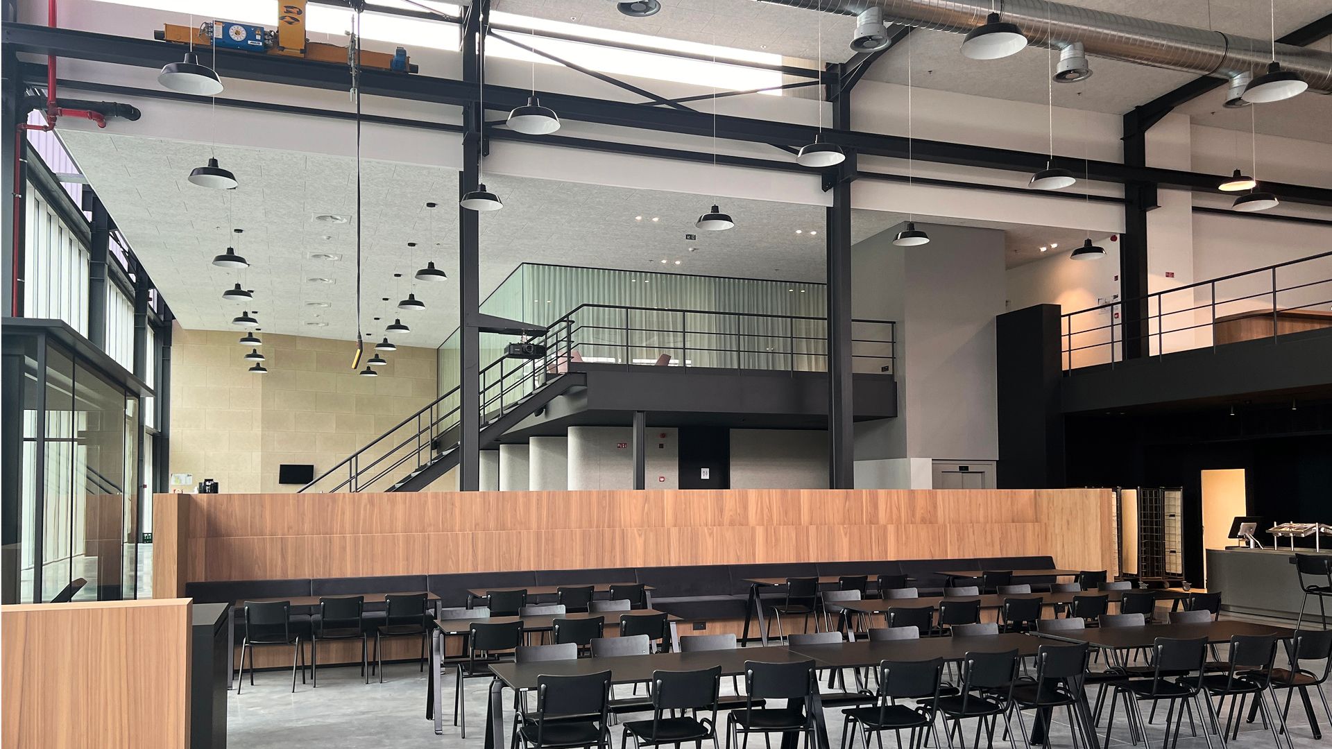 Sur la base des plans architecturaux, les options possibles ont été explorées, en vérifiant la faisabilité de l'état final souhaité, à partir de solutions comportant des éléments de base : colonnes, poutres, porte-à-faux, etc. Un mur-rideau élégant en aluminium à l'extérieur, un restaurant d'entreprise ultramoderne à l'intérieur. Ces nouveaux espaces intercalaires apportent chaque jour une valeur ajoutée au personnel, le pont roulant conservé étant un clin d'œil au passé.